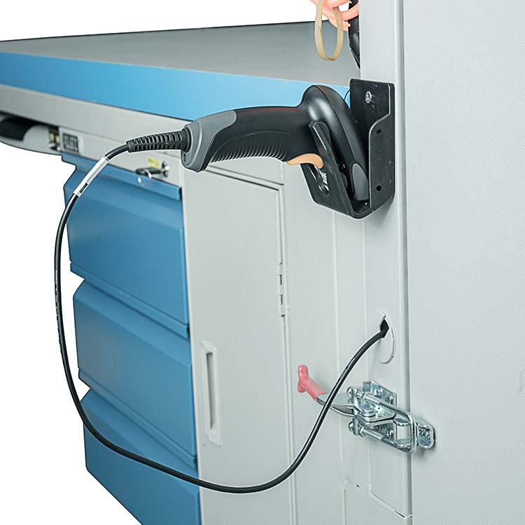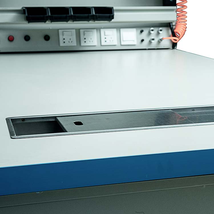 多功能工作臺具有掃碼,監(jiān)控攝像,報警,讀卡器,氣吹槍,顯示屏等功能,并帶有隱藏式電控箱獨立供電