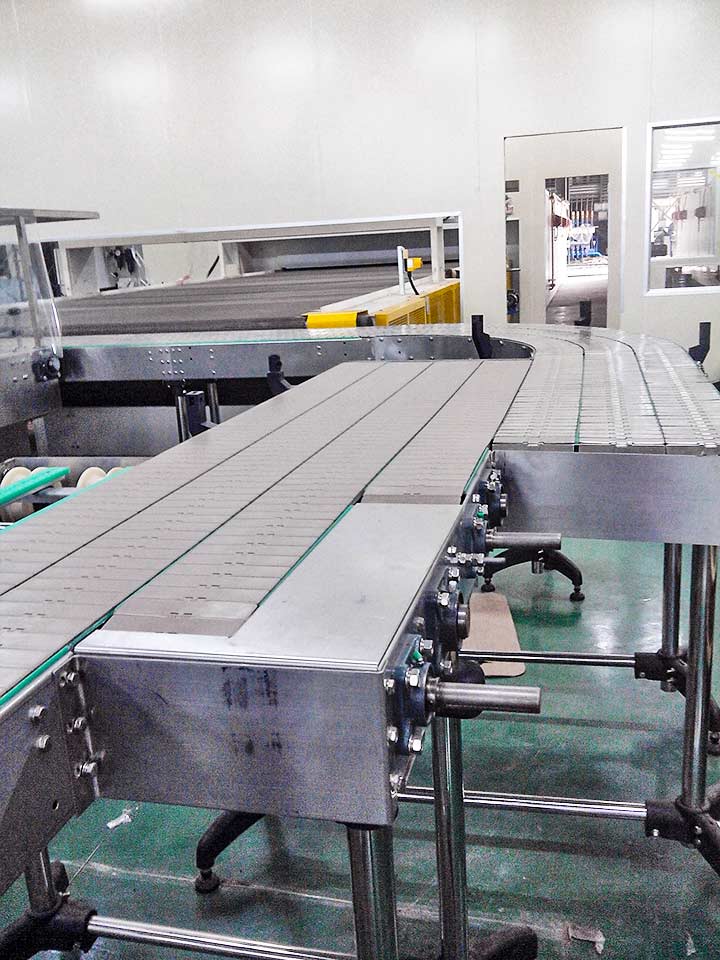 板鏈線由鏈條牽引,承重的鋼板、塑膠板等固定于輸送機兩側導軌內的鏈條上,作為承重機構,和生產線同步運行,可以實現(xiàn)產品的爬坡,可以實現(xiàn)生產的平穩(wěn)愉送。 鏈板選擇:碳鋼、不銹鋼、木質、塑鋼。