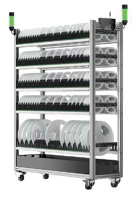 A型智能料架為標(biāo)準(zhǔn)7寸料盤(pán)存儲(chǔ)料架,雙面存放,1400個(gè)儲(chǔ)位,單色,多色可選,最大可支持7色