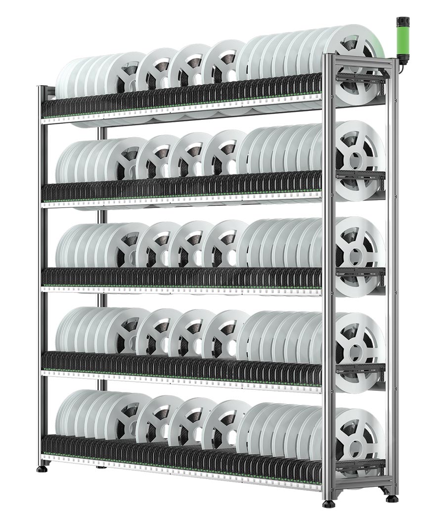 A型智能料架為標(biāo)準(zhǔn)7寸料盤存儲(chǔ)料架,雙面存放,1400個(gè)儲(chǔ)位,單色,多色可選,最大可支持7色