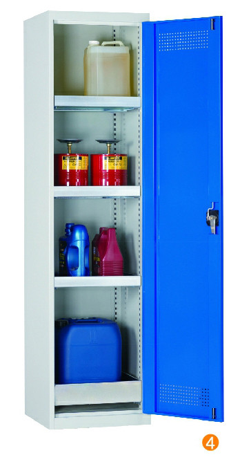 用于污染液體的存儲,可調(diào)式隔板,上下25mm可調(diào) 可移動式底部貯存盤高100mm,無縫焊接,更好防泄漏 門板的頂部及底部帶通風孔,自然通風,門開啟角度12。 隔板/貯存盤式層板每層最大承重60KG (可抽出式除外) 柜體最大承重承重:300KG
