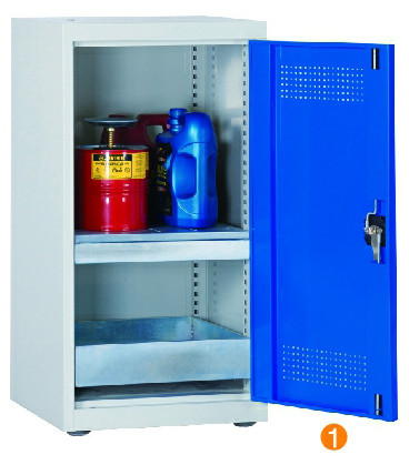 用于污染液體的存儲,可調式隔板,上下25mm可調 可移動式底部貯存盤高100mm,無縫焊接,更好防泄漏 門板的頂部及底部帶通風孔,自然通風,門開啟角度12。 隔板/貯存盤式層板每層最大承重60KG (可抽出式除外) 柜體最大承重承重:300KG