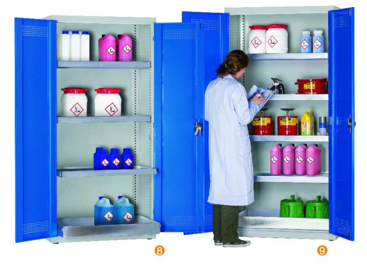 用于污染液體的存儲,可調(diào)式隔板,上下25mm可調(diào) 可移動式底部貯存盤高100mm,無縫焊接,更好防泄漏 門板的頂部及底部帶通風孔,自然通風,門開啟角度12。 隔板/貯存盤式層板每層最大承重60KG (可抽出式除外) 柜體最大承重承重:300KG